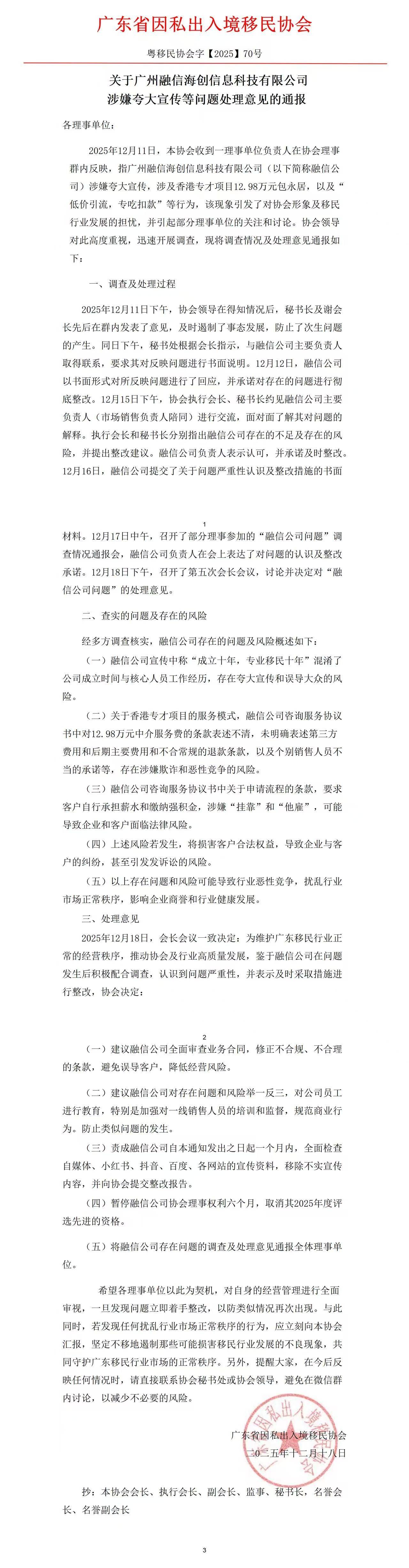 北京资讯网2025年12月23日讯(记者:李杰)广东省因私出入境移民协会近日首次通报典型案例,剑指广州融信海创信息科技有限公司(以下简称“融信海创”)的系列违规行为。